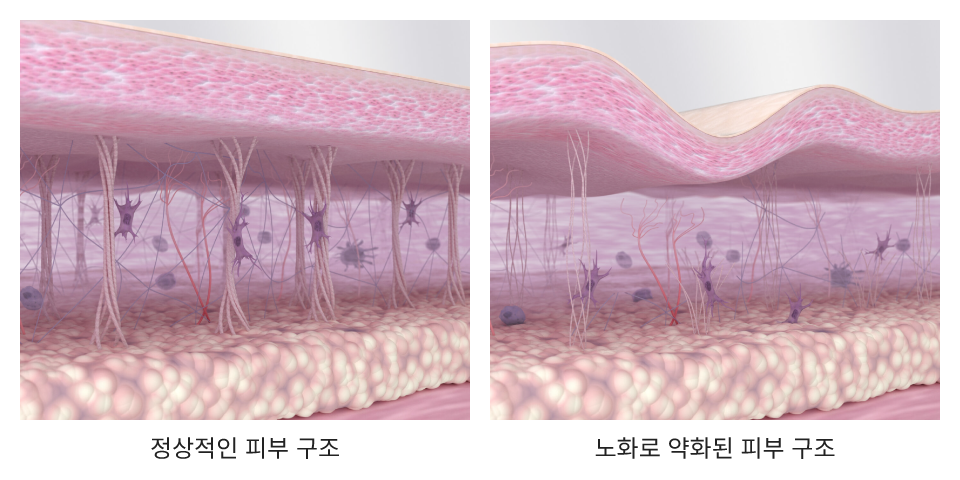 하지만 시간이 흐르고 외부 자극이 누적되면서, 진피층을 지탱하던 ECM 성분들은 점차 유실되고 파괴됩니다. 팽팽했던 피부가 얇아져 힘을 잃고, 탄력이 저하되며, 눈에 띄게 속건조와 잔주름이 늘어나는 과정. 우리는 이처럼 진피층의 구조가 무너져 내리는 일련의 현상을 노화라고 부릅니다.